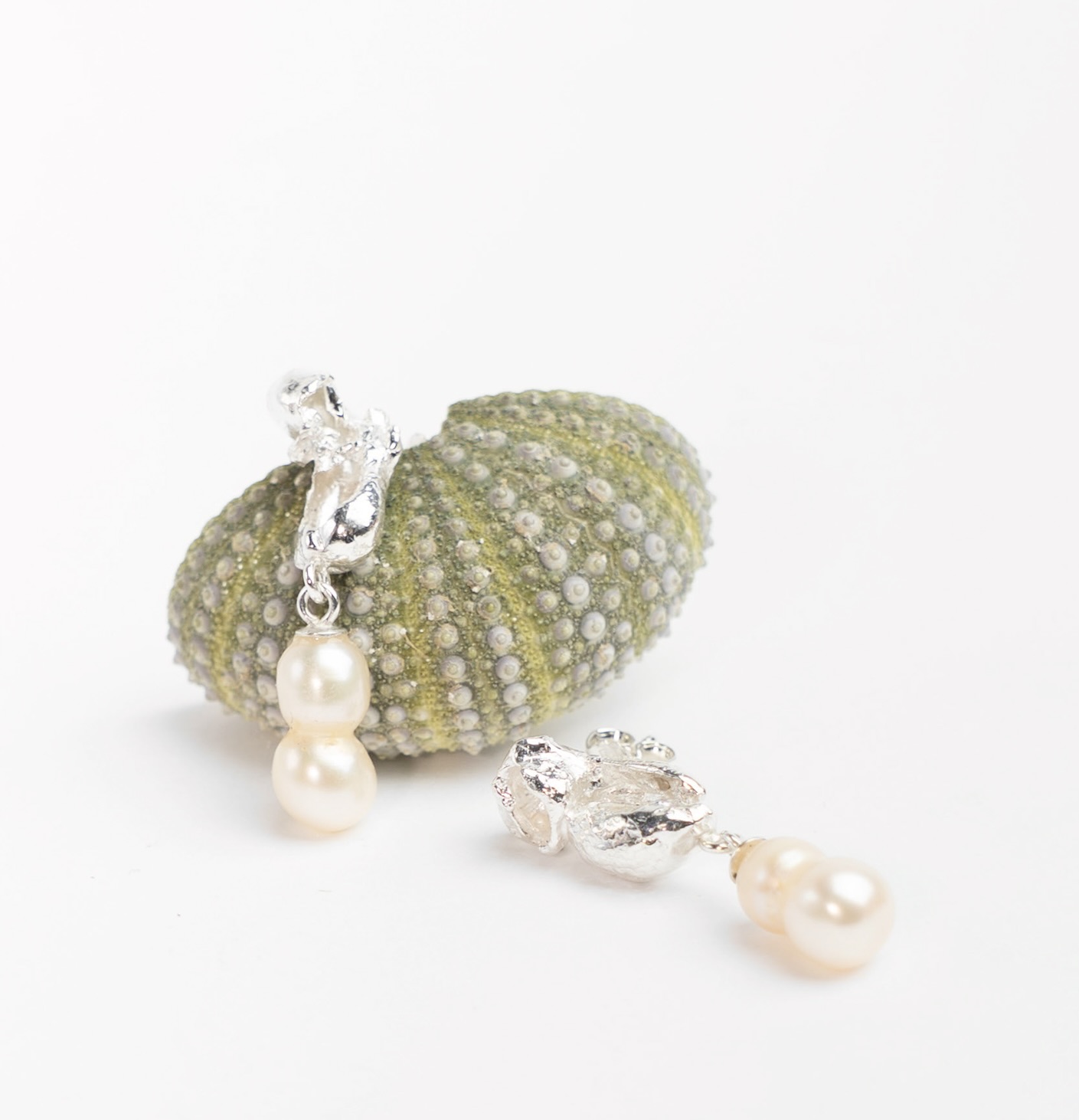 Vandstøbeteknikken gør sølvets former bløde og organiske, næsten som barokke perler. Da vi ikke støber efter en fast form bliver et sæt øreringe aldrig helt identiske, det er netop charmen ved det. Derfor sælges de fleste øreringe enkeltvis, så man selv kan sammensætte sit par. Kom ind i butikken og se hele udvalget eller send os en mail, så sender vi billeder af det vi har på lager.