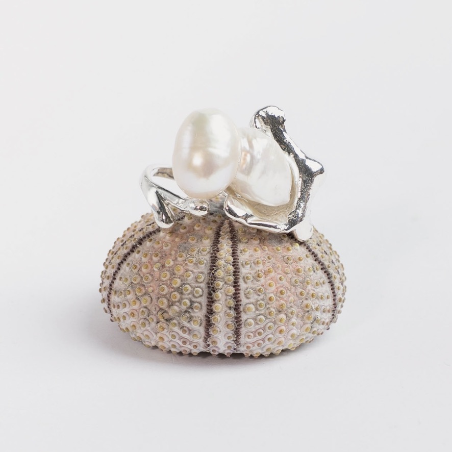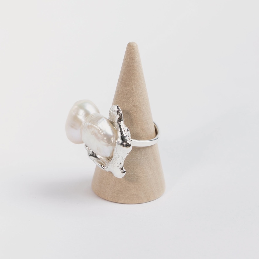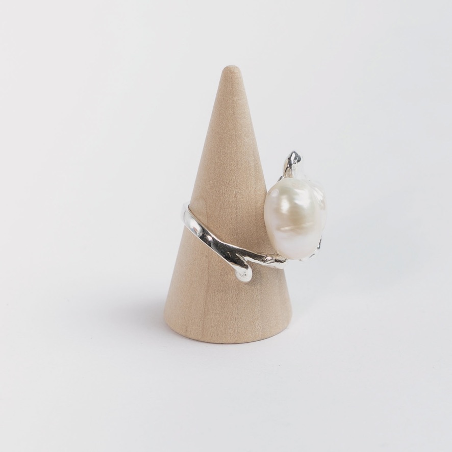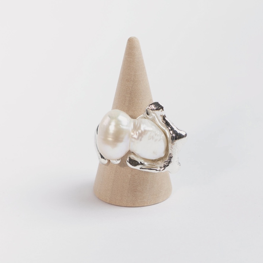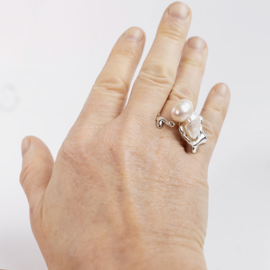 Åben maximalistisk unika sølvring i organisk form med stor hvid dobbeltperle. Fladen måler i alt ca. 27 x 24 mm inkl perle og ringen er størrelse 53. Da ringen er åben kan den udvides en lille smule.