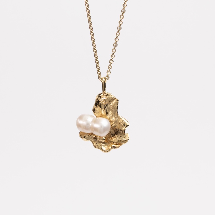 Unika forgyldt sølvvedhæng i organisk form med doppelt ferskvandsperle. Vedhænget måler ca. 20 x 28 mm.