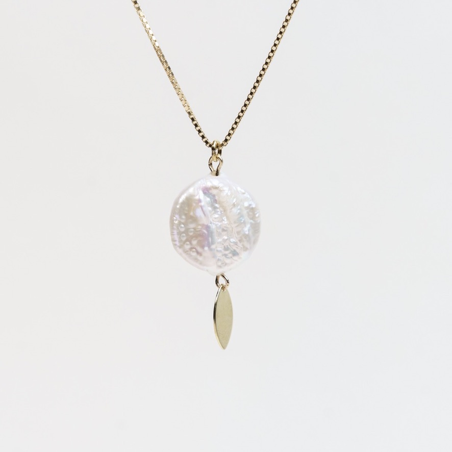 Stor flad barok perle med lille forgyldt sølvblad. Halskæde i forgyldt sølv. Kæden er 50 cm.