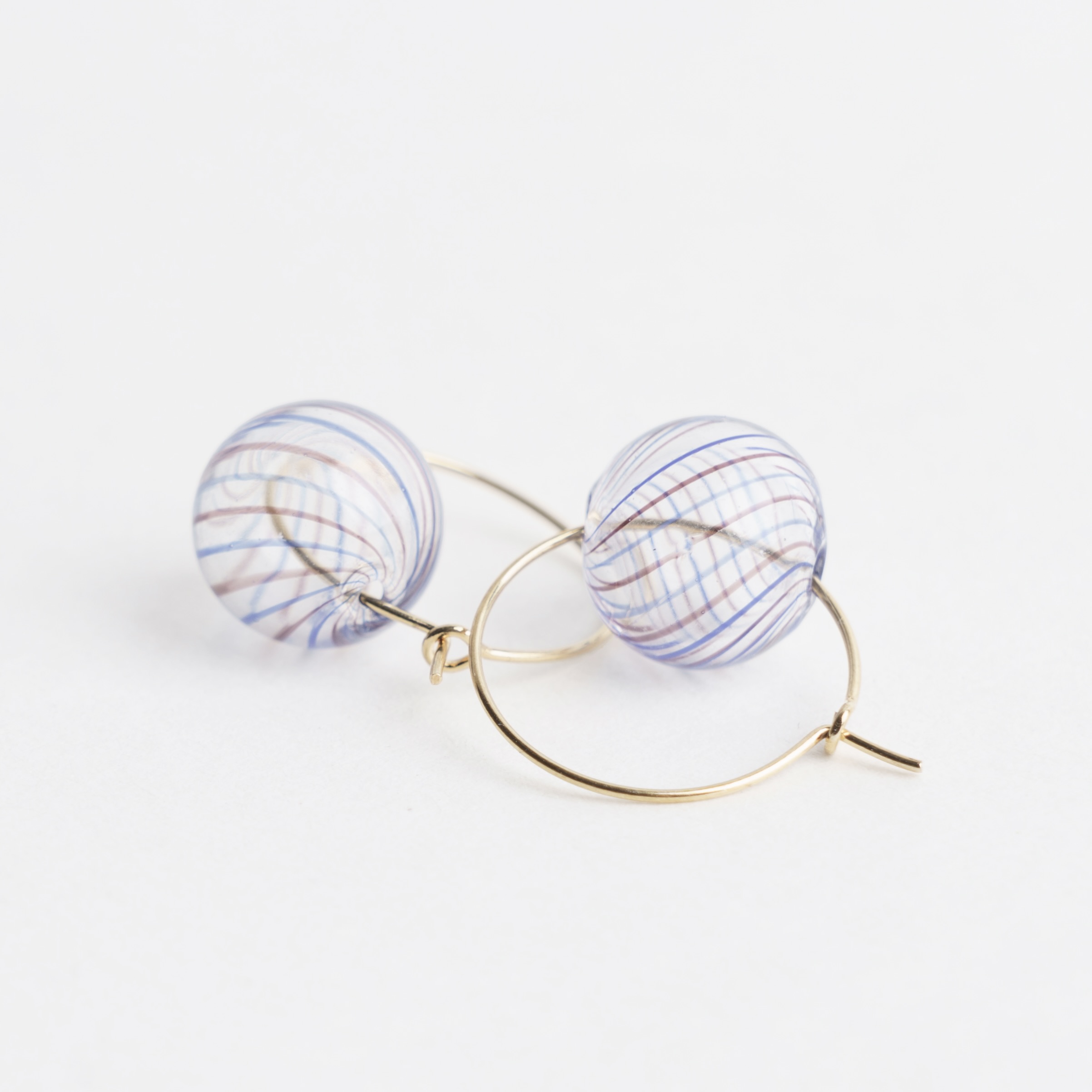 Tynde hoops i sølv eller forgyldt sølv med lille klar boble i transparent blå- og brunstribet mundblæst glas. Boblen måler Ø 14 mm og hoop’en fås i Ø 20 eller 30 mm.