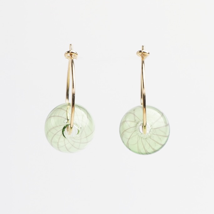 Tynde hoops i sølv eller forgyldt sølv med lille stribet boble i transparent mundblæst grønt glas.