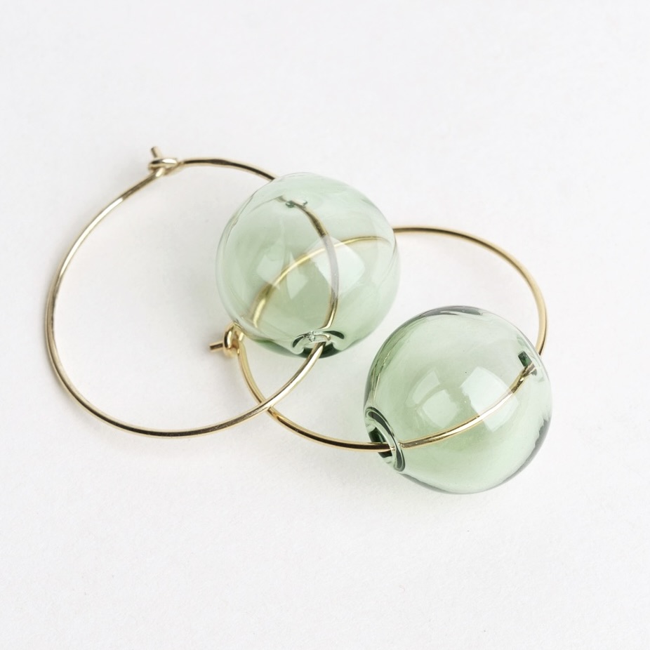 Tynde hoops i sølv eller forgyldt sølv med lille boble i transparent mundblæst grønt glas. Boblen måler Ø 18 mm og hoop’en fås i Ø 30 eller 40 mm.