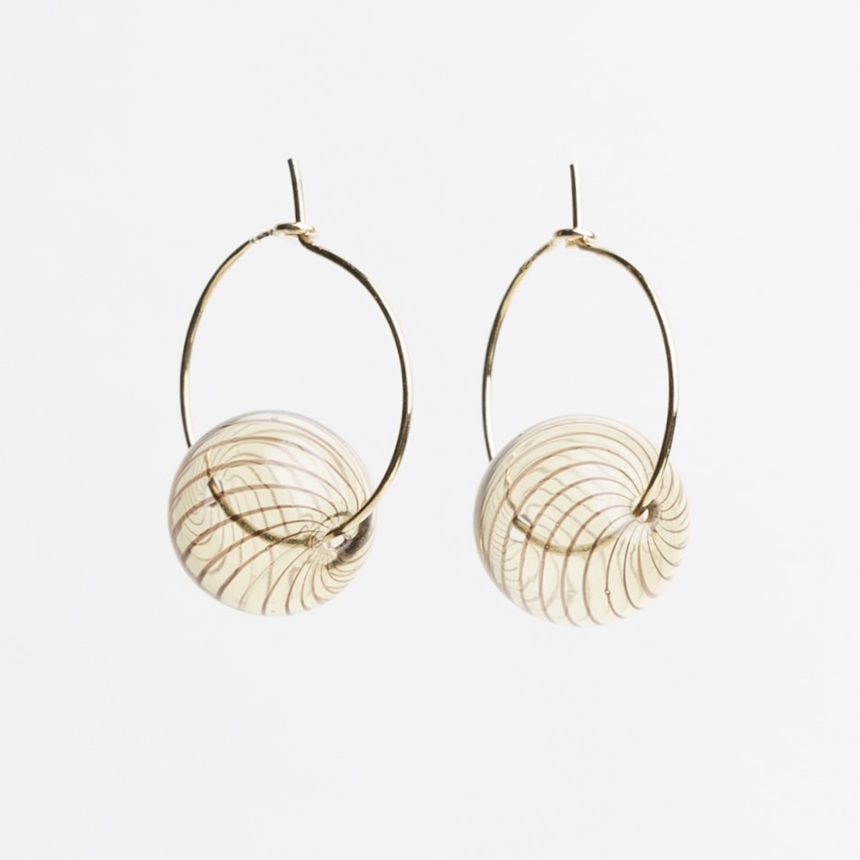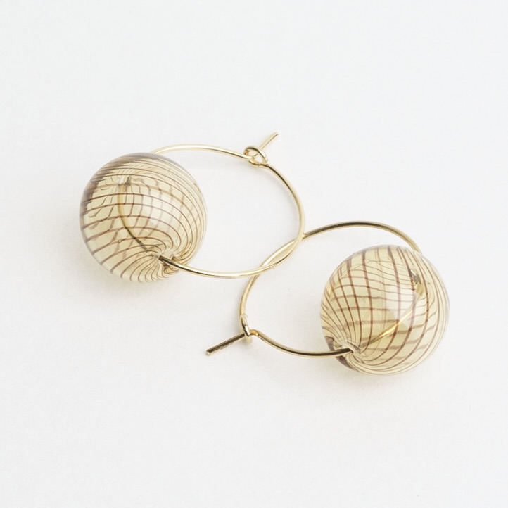 Tynde hoops i sølv eller forgyldt sølv med lille boble i mundblæst glas med med te-farvede striber. Boblen måler Ø 14 mm og hoop’en fås i Ø 20 eller 30 mm.