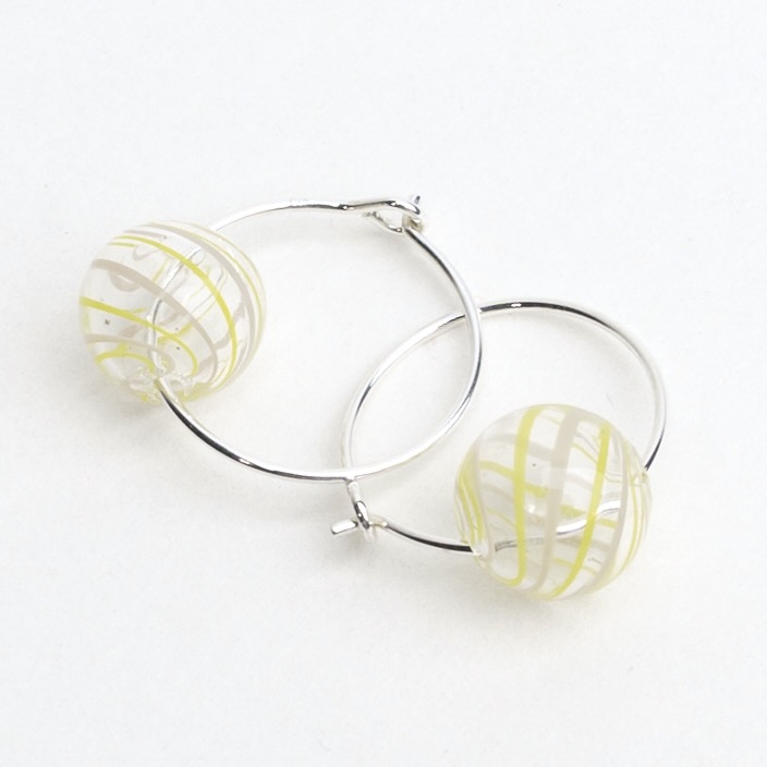 Tynde hoops i sølv eller forgyldt sølv med lille boble i transparent mundblæst glas med hvide og gule striber. Boblen måler Ø 13 mm og hoop’en fås i Ø 20 eller 30 mm.