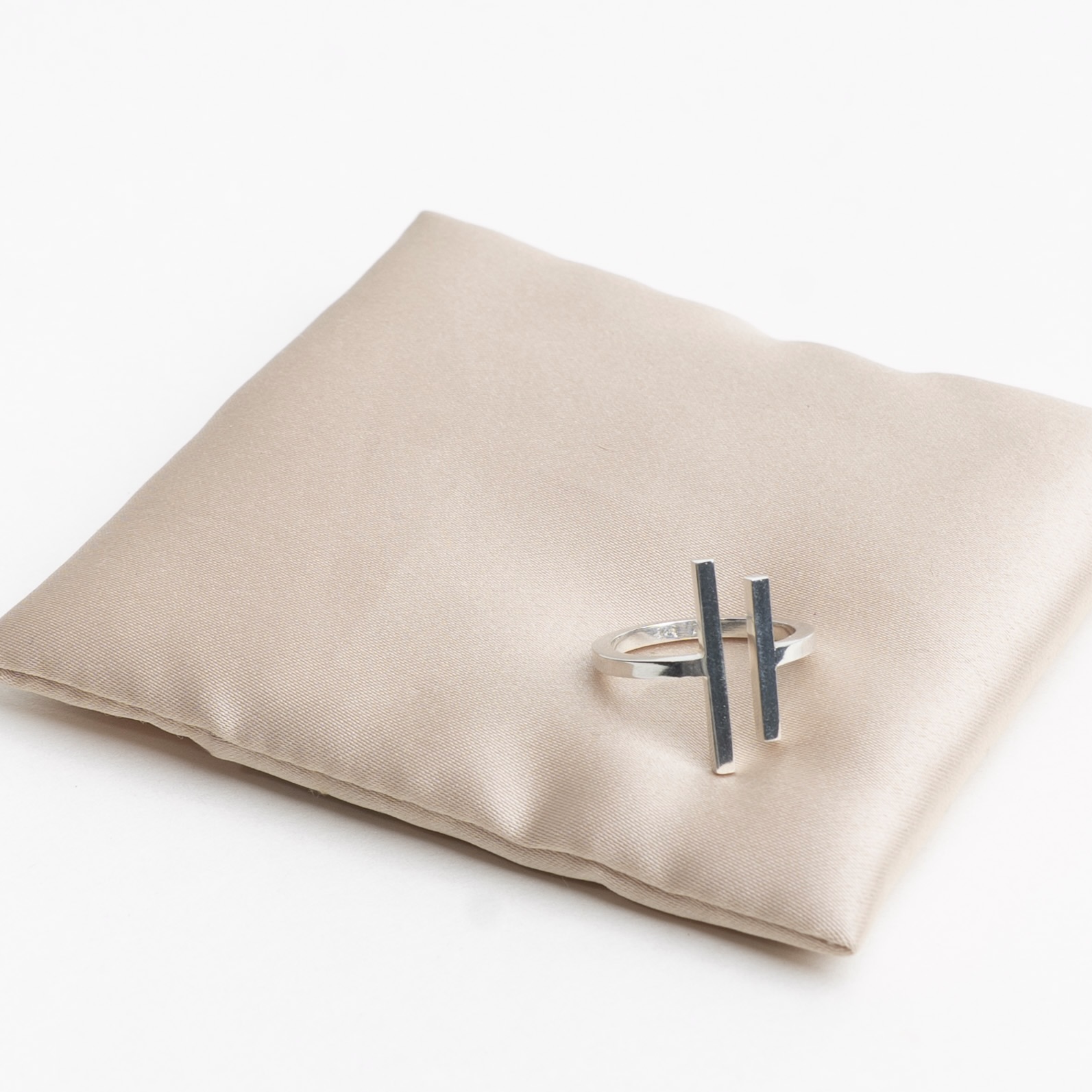 Ring i sterlingsølv med to kantede stave. Ringen er åben og kan derfor reguleres en anelse i størrelsen.
