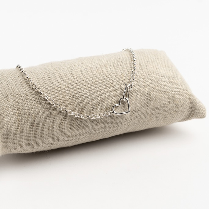Halskæde i sølv med ærtekæde og håndlavet hjerteformet lås. Placér låsen skråt foran så den bliver en del af smykket.
