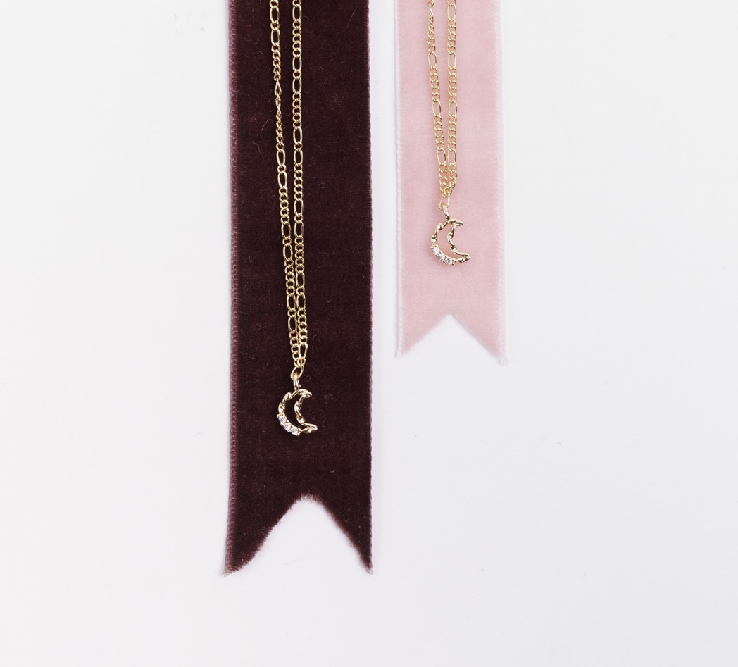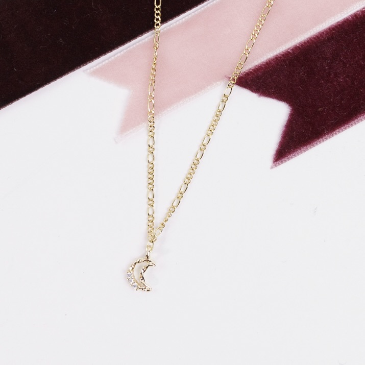 Halskæde i forgyldt messing med Figaro mønster samt vedhæng med lille måne med små hvide zirkonia.