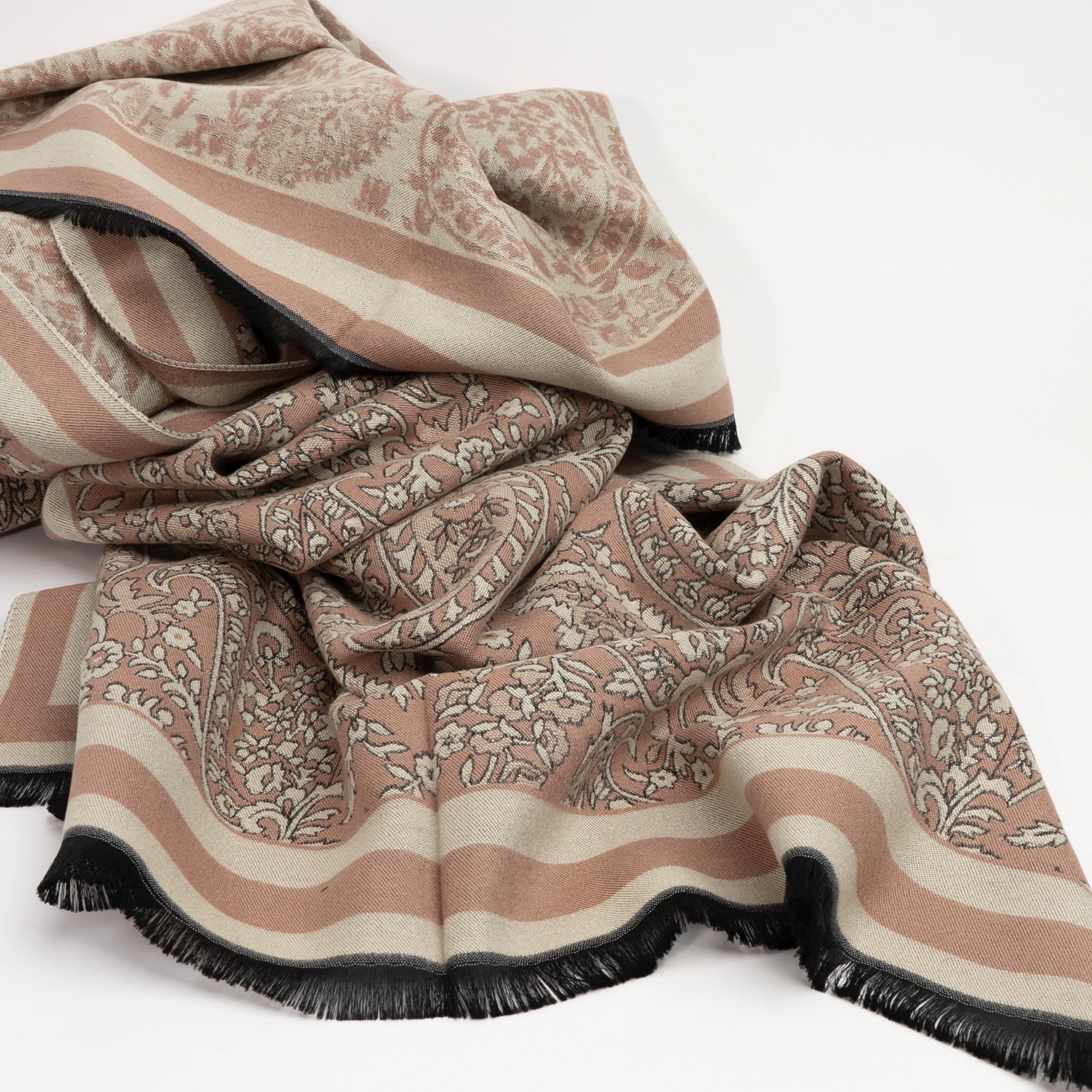 Superblødt, lidt kraftigt halstørklæde med blomstermønster i gammelrosa, creme og grå. 70% viskose, 30% uld.