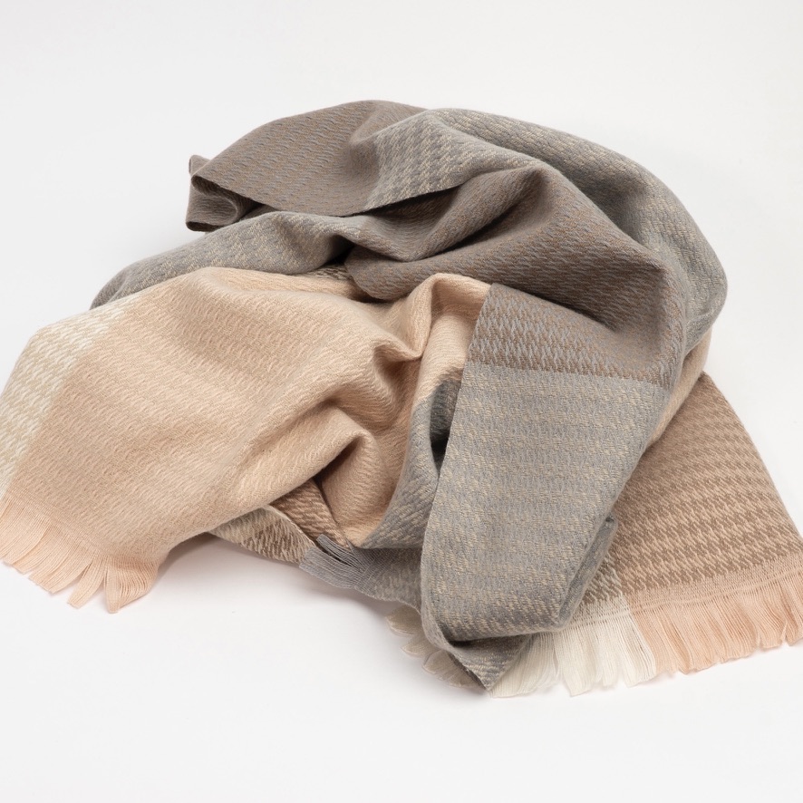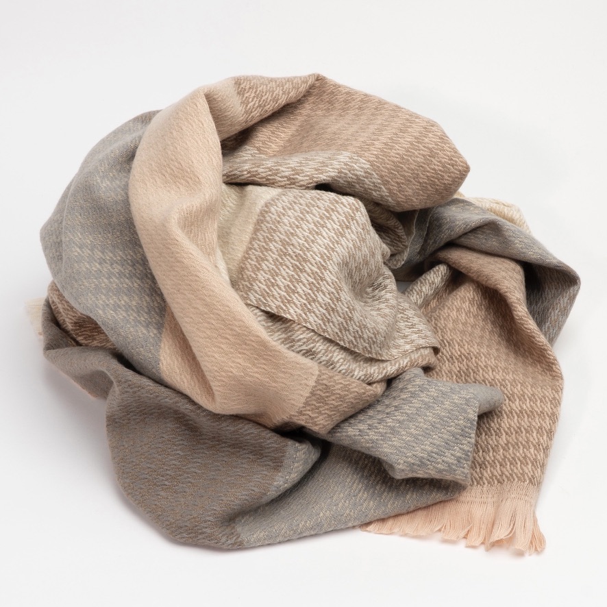 Superblødt, lidt kraftigt halstørklæde med hanefjedsmønster i rosa, beige, gråblå og brune nuancer. 30% uld, 70% viskose.