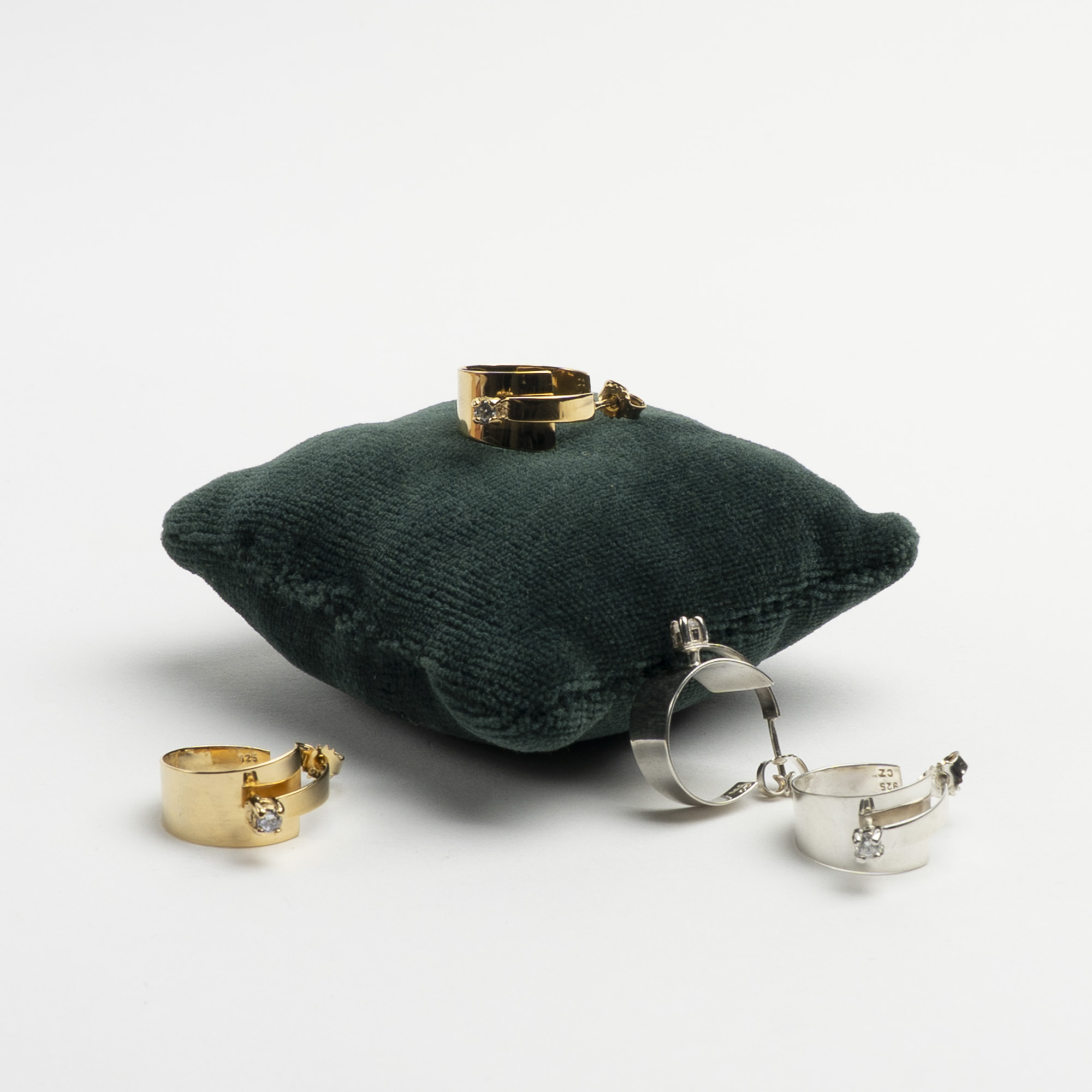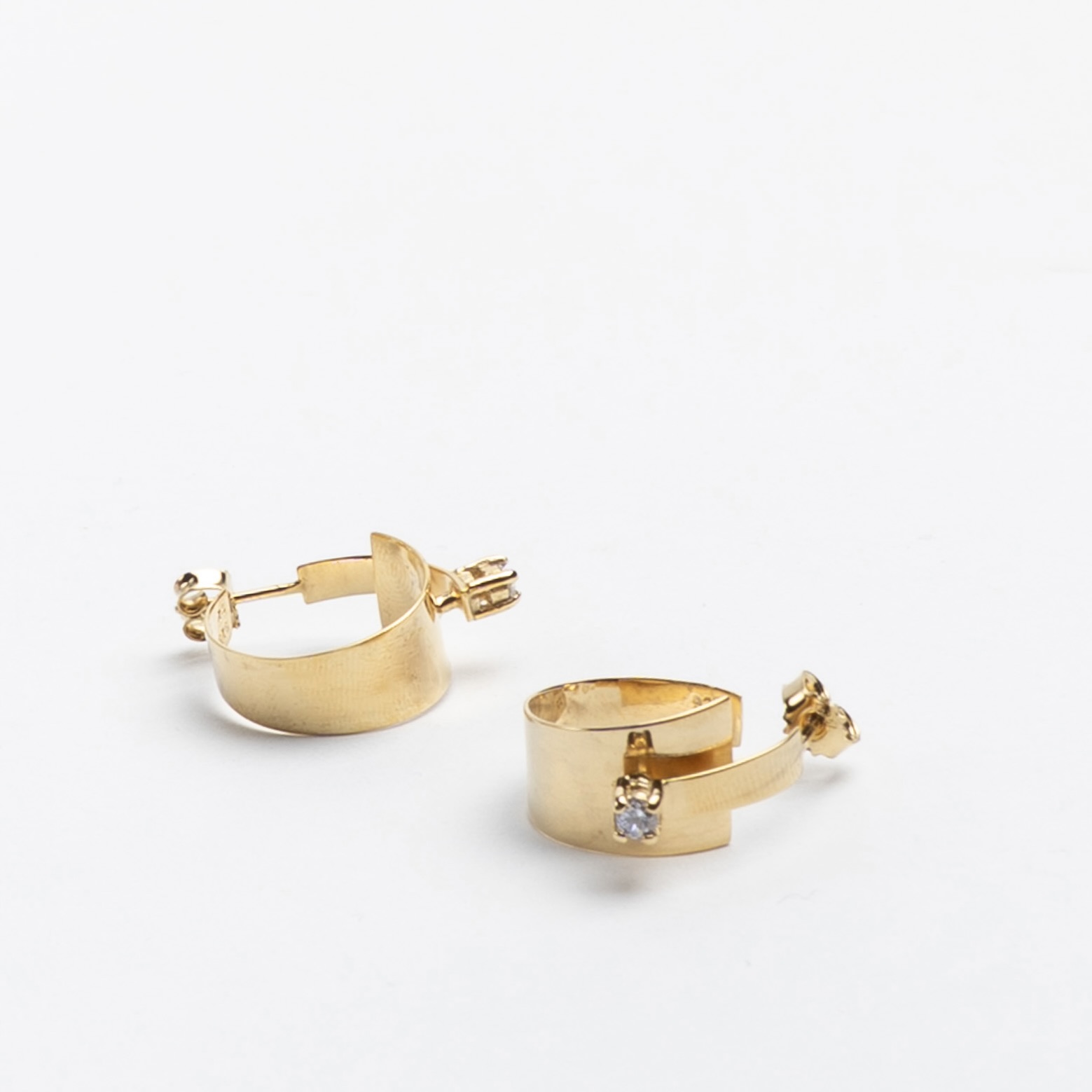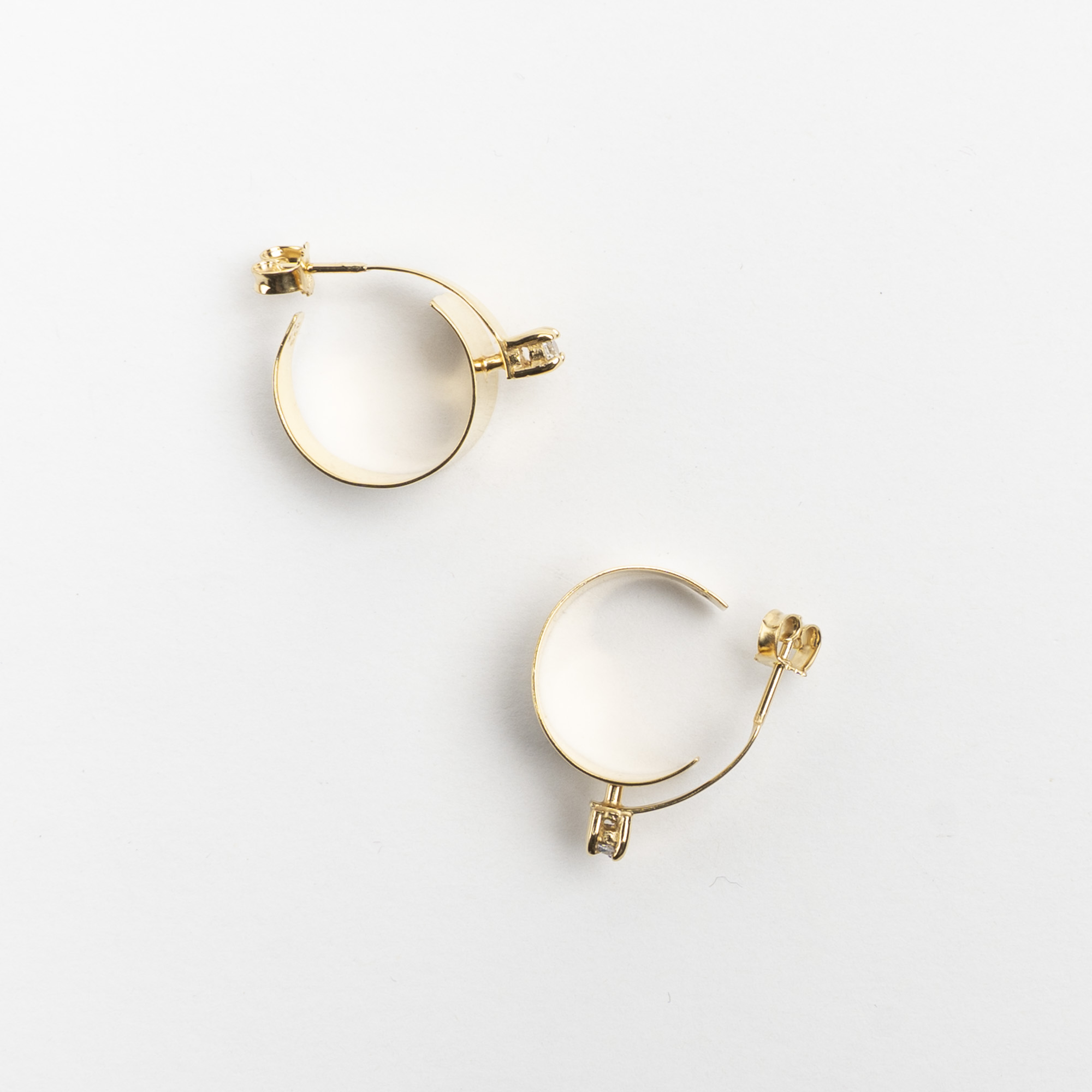 Håndlavede øreringe i sølv eller forgyldt sølv med hvid kubisk zirkonia. Måler Ø 20 mm.
