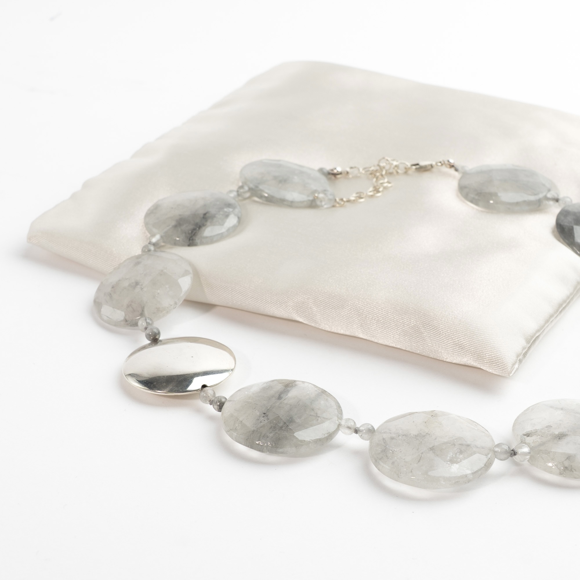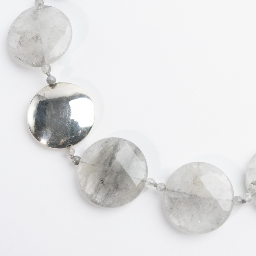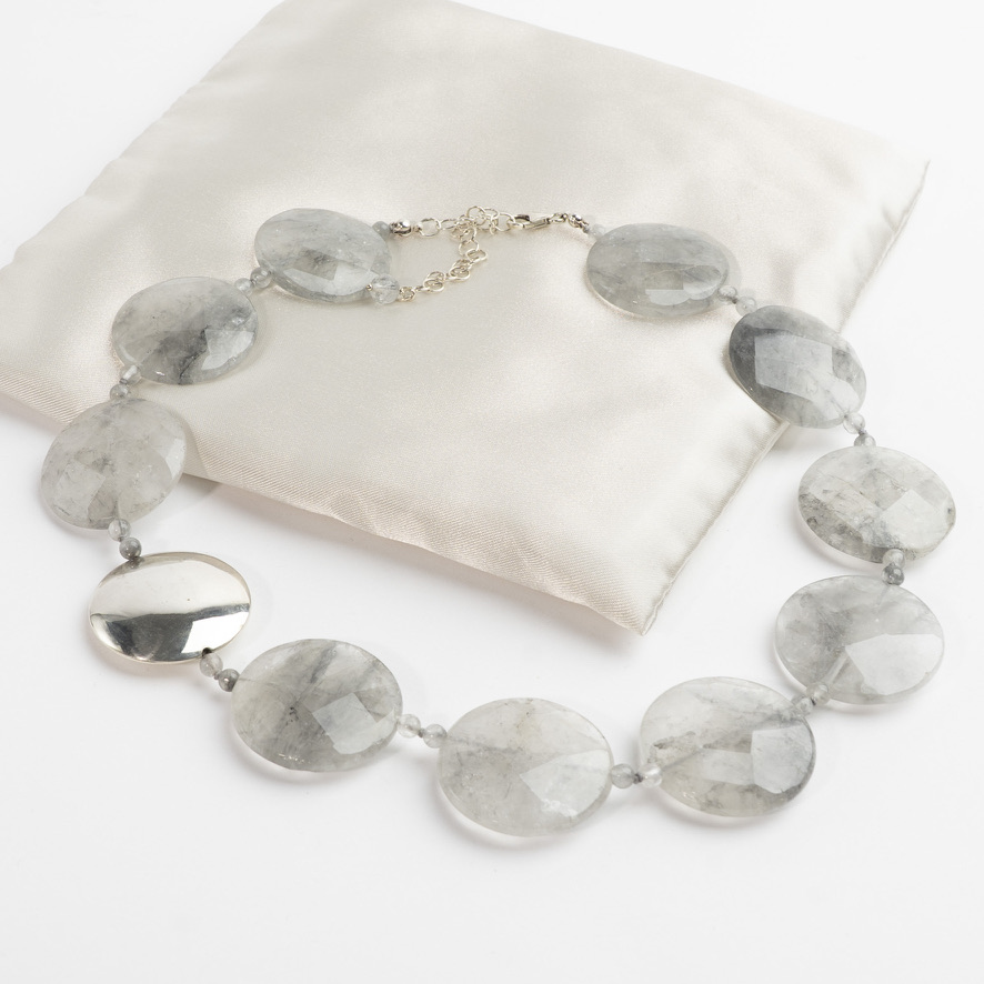 Statement-halskæde med smukke, flade grå halvædelsten og stor sølvperle. Lås i sølv. Længde 45-52 cm. Stenene måler Ø 30 mm.