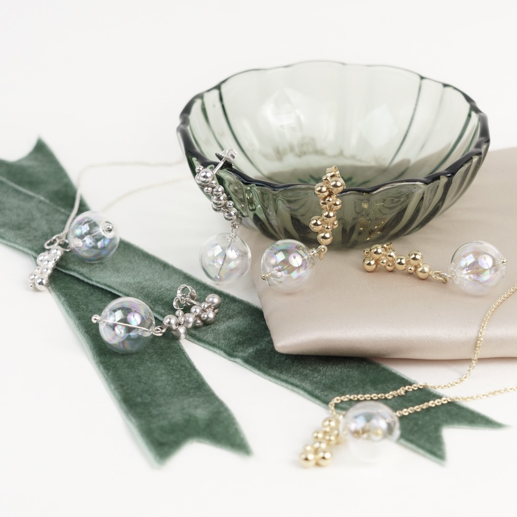 Ørestikekrne er en del af vores Bubble Collection, som består af smykker med glasbobler. Sølvboblerne er håndlavet på vores lille værksted i Svendborg.