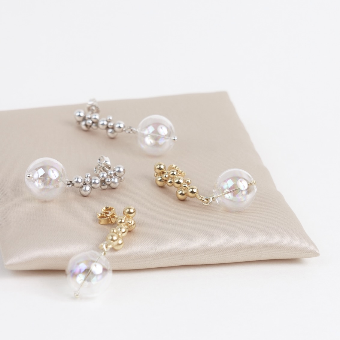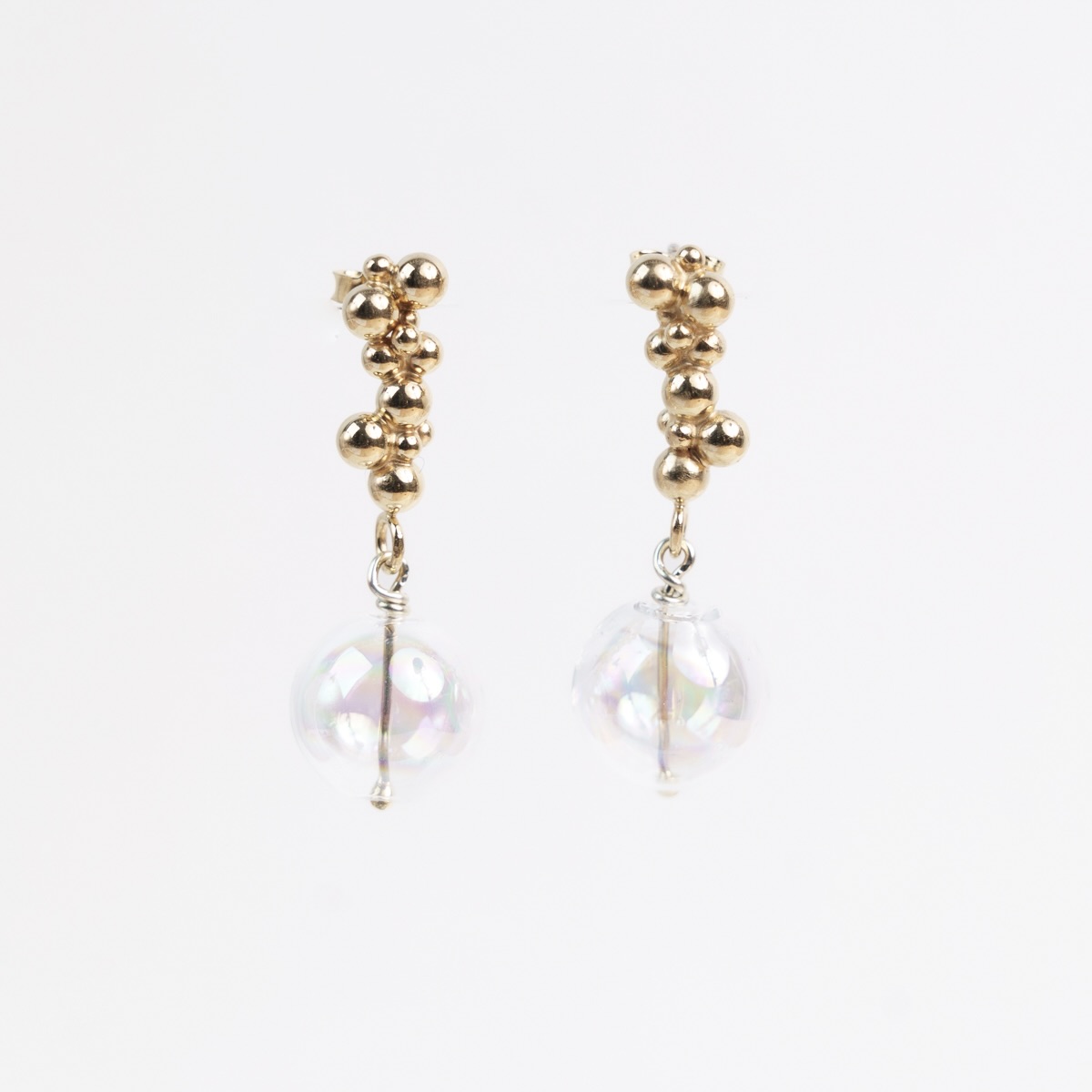Ørestikker med “sæbebobler” i sølv eller forgyldt sølv samt mundblæst boble i glas.