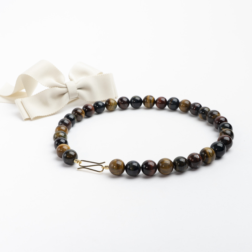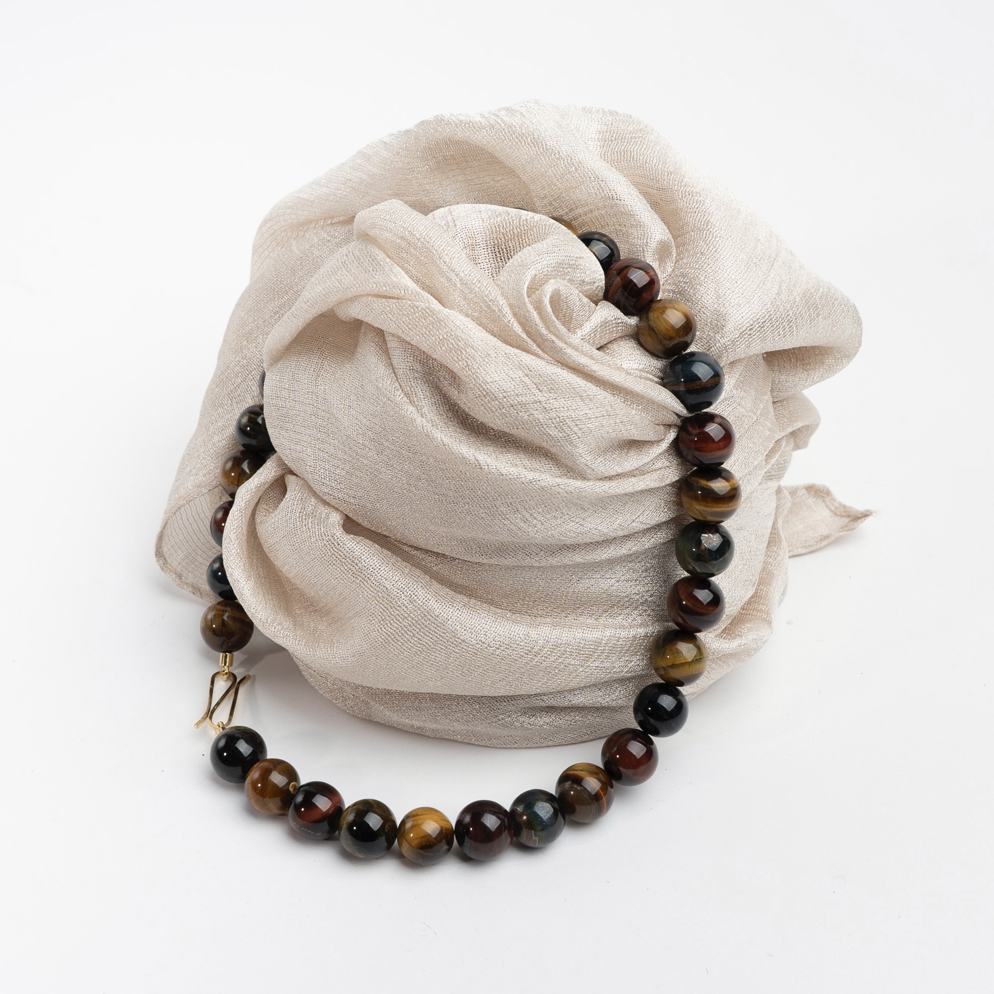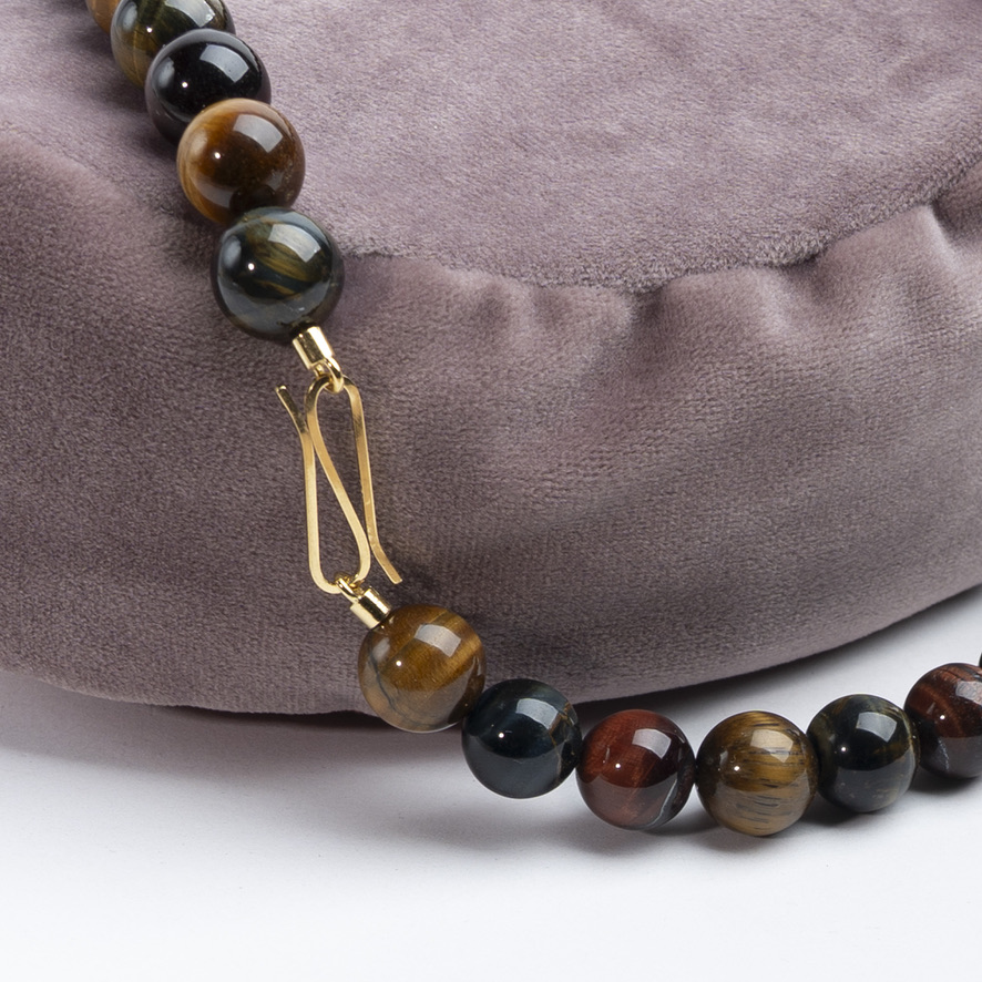 Klassisk halskæde med den lækreste “powersten” tigerøje i multicolour (rødlige, grønlige og gullige toner) og håndlavet lås i forgyldt sølv. Længde 45,5 cm. Stenene måler Ø 14,5 mm.